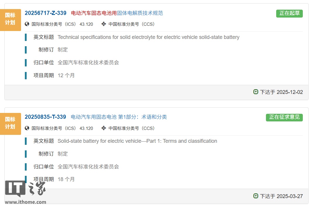 12 月 31 日消息,《电动汽车用固态电池第 1 部分:术语和分类》国家标准已进入征求意见阶段,系列标准将分四部分推进。