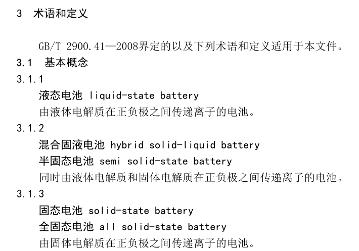 编制说明称,考虑到半固态电池、全固态电池等术语已在行业内广泛使用,文件将“半固态电池”作为“混合固液电池”的许用术语,将“全固态电池”作为“固态电池”的许用术语。