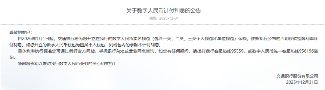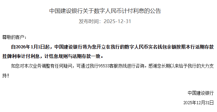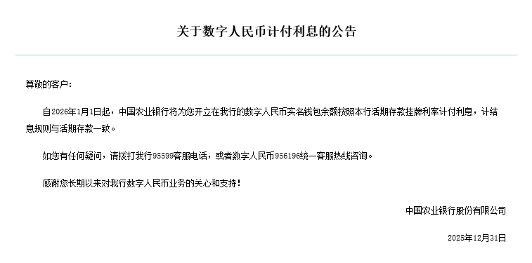 12 月 31 日消息,工商银彳、农业银彳、中国银彳、建设银彳、交通银彳、邮储银彳等多家银彳今天(12 月 31 日)发布公告,从 2026 年 1 月 1 日起,将为客户开立的数字r民币实名浅包余额按照活期存款挂牌利率计付利息,计结息规则与活期存款一致。