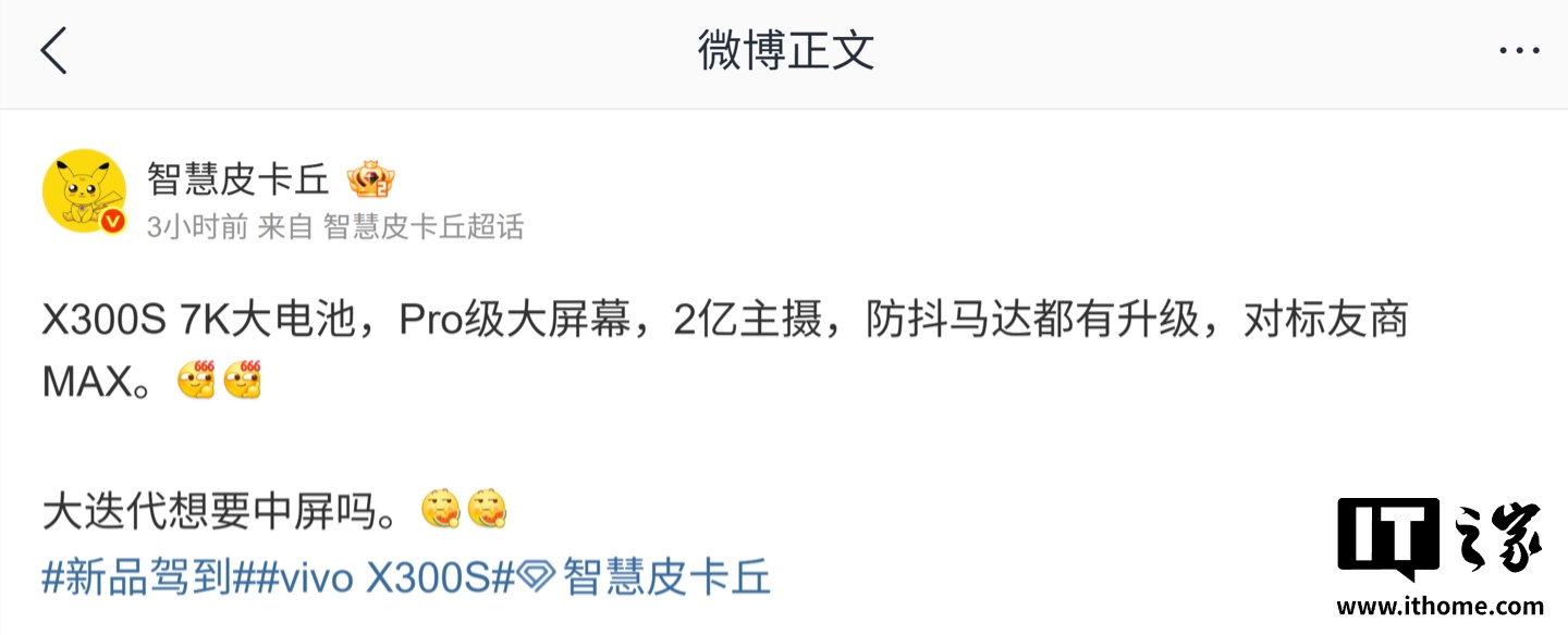 1 月 18 日消息,博主 @智慧皮卡丘 今天在微博透露,某厂的 X300s 手机将搭载 7K 级大电池。
