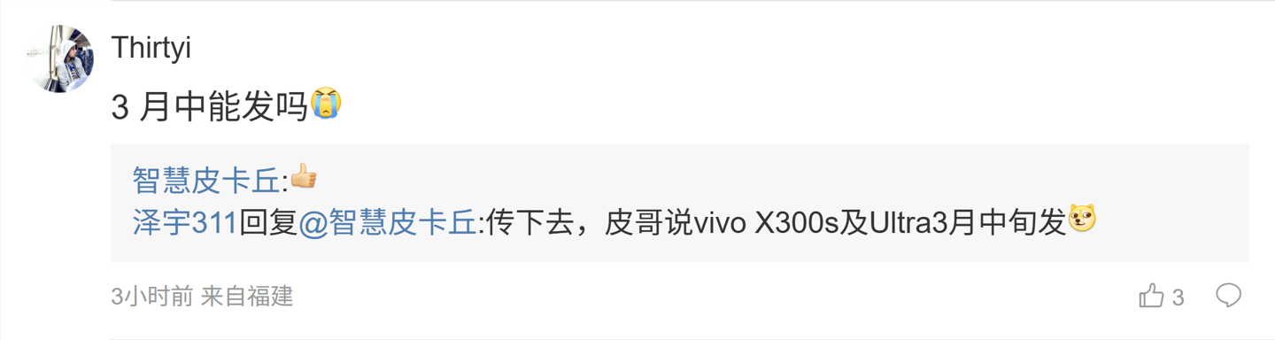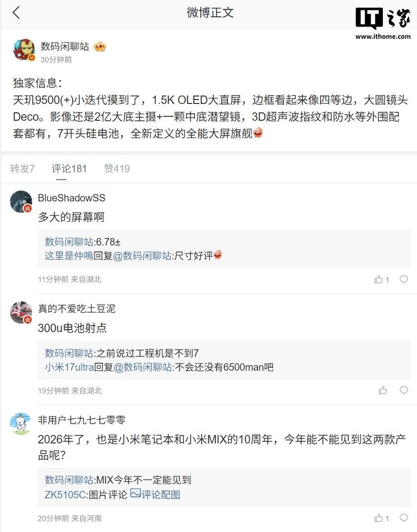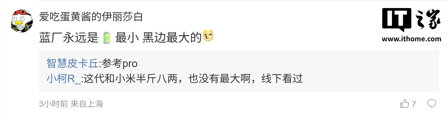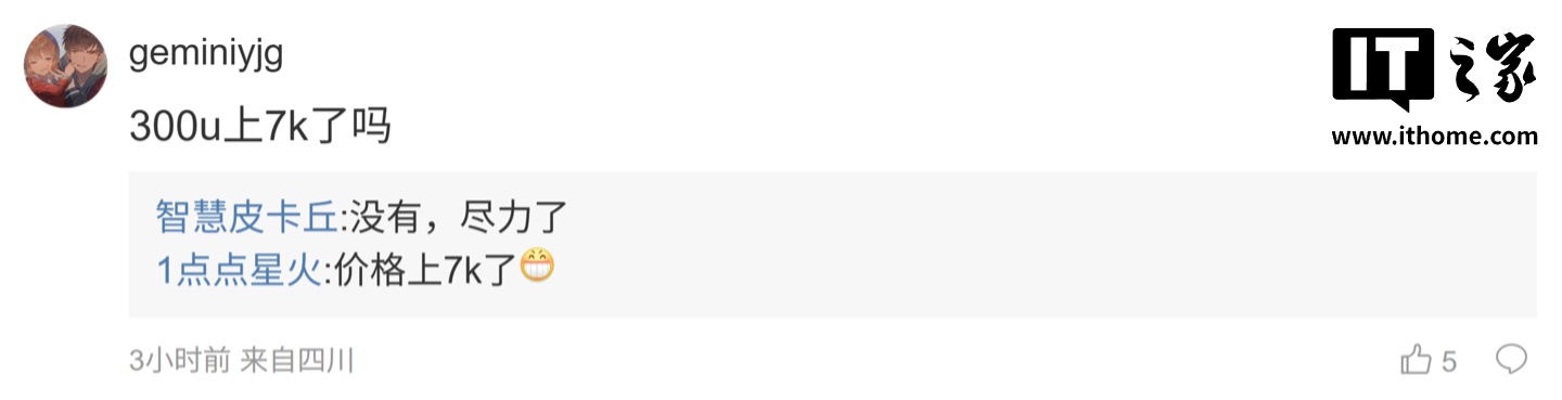 后续有用户在评论区询问:“300u 上 7k 了吗”,博主回复道:“没有,尽力了”;另一名用户则表示:“蓝厂永远是?最小黑边最大的 ”,博主回复道:“参考 pro”;而另外一名网友则询问道:“3 月中能发吗”,博主表示:“