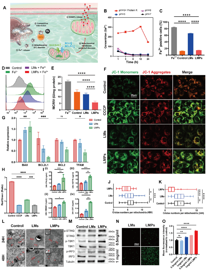 从溶酶体逃逸后,可变形液态金属颗粒持续释放的镓离子进一步介导了线粒体损伤机制,释放的 Ga³⁺通过铁替代途径破坏线粒体铁硫簇组装,干扰了线粒体电子传递链功能,进而触发免疫原性细胞死亡(图 4)。