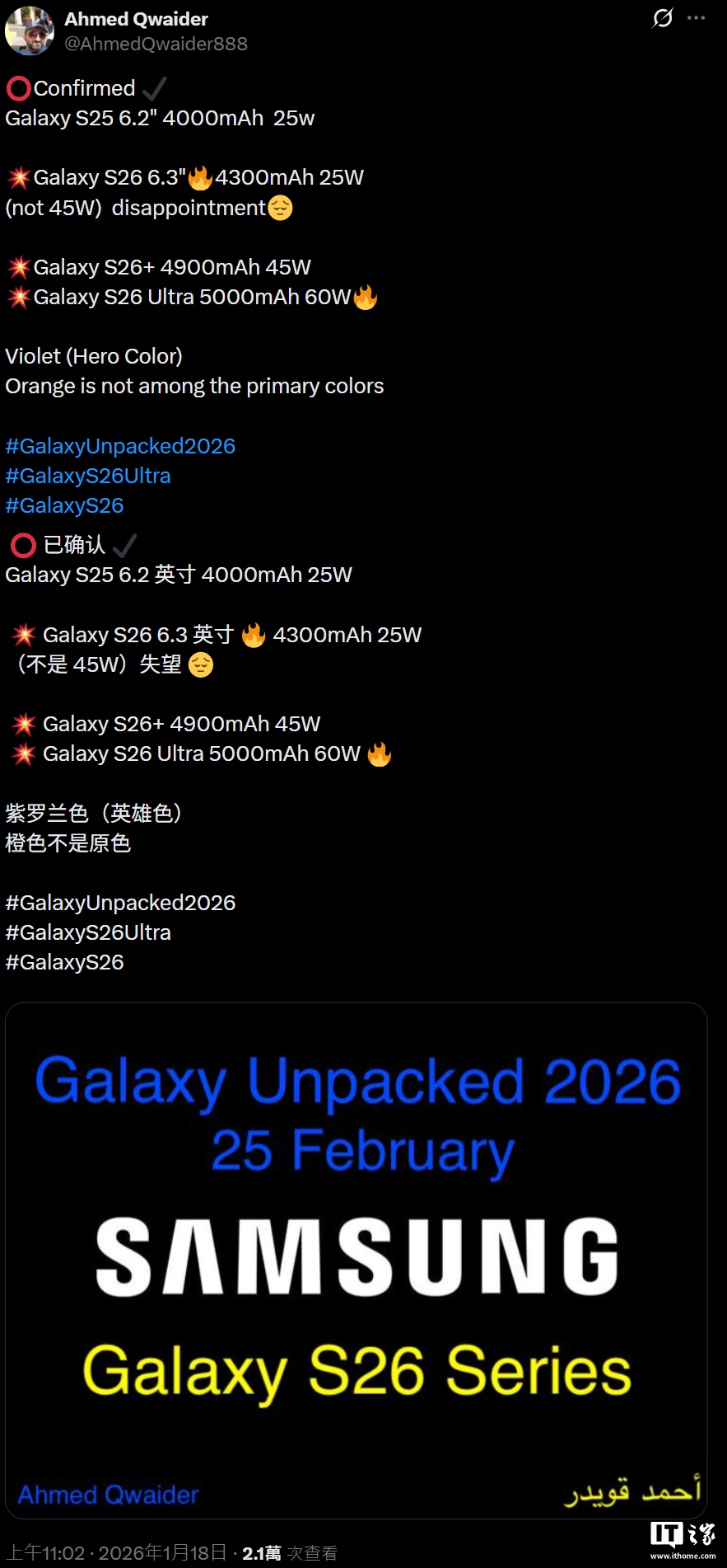 1 月 18 日消息,消息人士 Ahmed Qwaider 今天在 X 平台发文,曝光三星 Galaxy S26 系列手机的电池容量、充电速度。