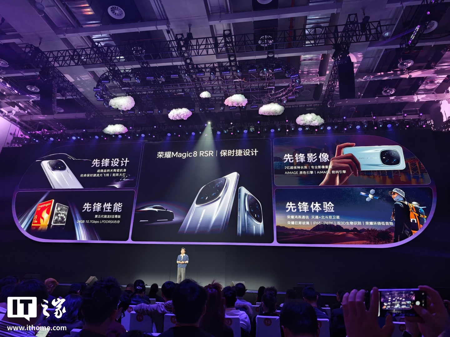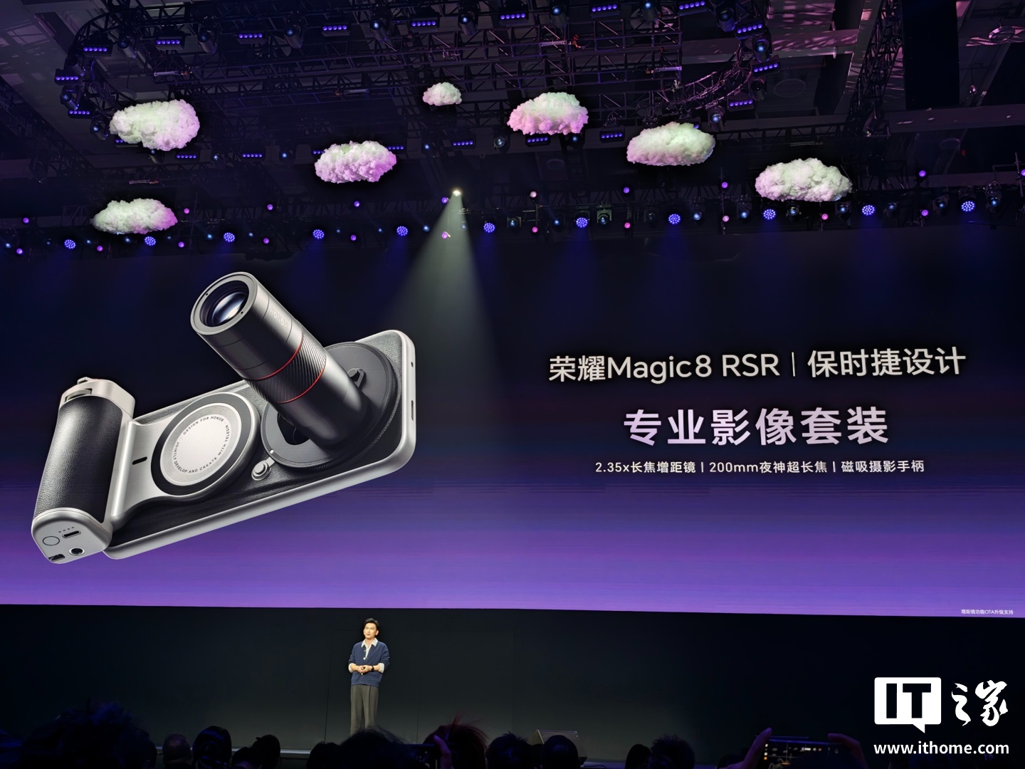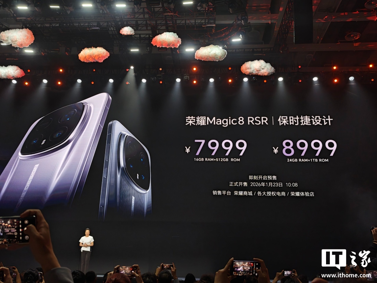 1 月 19 日消息,荣耀今晚召开新品发布会,发布 Magic 8 RSR 保时捷设计手机,新机主打“先锋设计”,拥有经典保时捷流光飞线,搭载第五代骁龙 8 至尊版芯片,拥有 2 亿像素超夜神长焦,支持安装专业影像套装,1 月 23 日上午 10:08 正式开售。