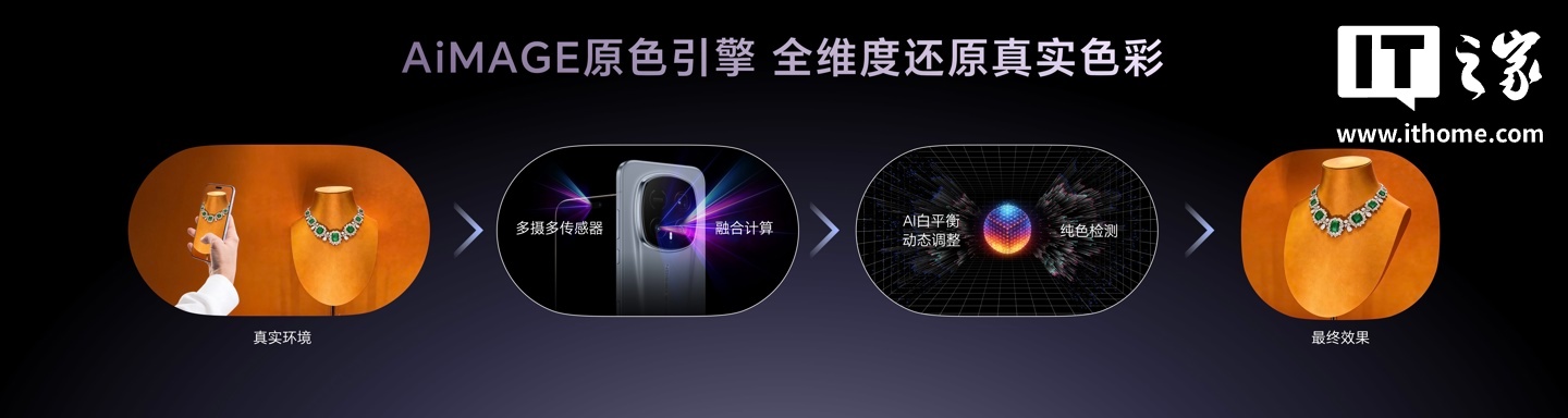 值得注意的是,这款手机还带有 AiMAGE 原色引擎,可通过多摄多传感器、融合计算还原真实环境色彩,AI 可接入白平衡调整、纯色检测环节,防抖引擎通过 CIPA 6.5 级认证,可让画面变得更稳,号称“主摄长焦手持 3 秒不糊片”。