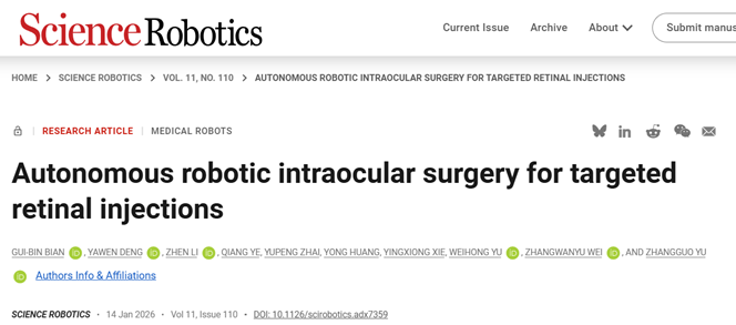 1 月 19 日消息,据中国科学院自动化研究所官方微信公众号消息,该所多模态人工智能系统全国重点实验室边桂彬研究员课题组成功研发一款自主显微眼科手术机器人系统,并验证了临床可行性。该系统在整个眼内空间可实现自主的视网膜下和血管内注射,可显著提高眼底注射的精确性、安全性和一致性,最大限度地减少医源性损伤,可辅助外科医生更加专注于手术设计和监督任务。相关成果近日发表于《科学•机器人》(Science Robotics)。