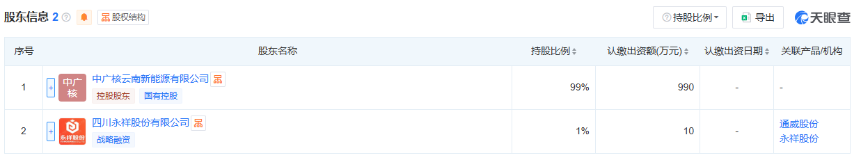 据天眼查股权穿透显示,该公司由中广核集团旗下中广核云南新能源有限公司(持股99%)、通威股份旗下四川永祥股份有限公司(1%)合资成立。