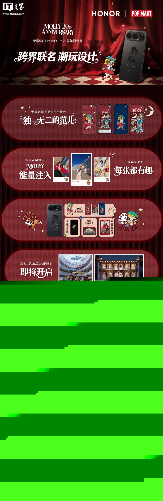1 月 23 日起,北京、上海等全国 100 城联动,开启荣耀 500 Pro 与 MOLLY 20 周年联名主题店及联名快闪活动。来荣耀门店参与活动打卡,即可获取限量联名周边,购买荣耀 500 Pro 限定版即赠豪华礼盒。