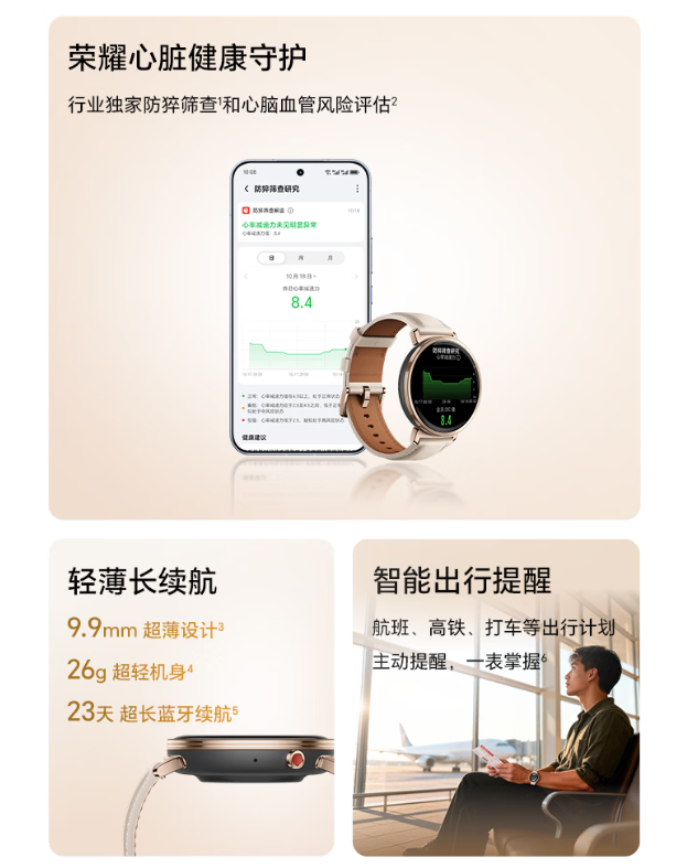 新品支持荣耀心脏健康研究,全方位监测心脏状态。针对疑似房颤、早搏,睡眠呼吸暂停、心律不规则的情况,进行风险筛查预警。该产品还支持全天候实时健康监测,包括心率、血氧、压力,睡眠 HRV 等。