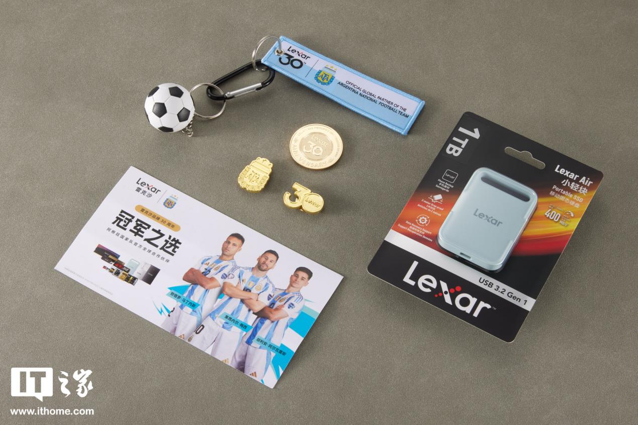 此前在 2026 国际消费电子展(CES)上,消费类存储品牌雷克沙(Lexar)宣布与阿根廷国家足球队达成官方全球合作伙伴关系。这也是雷克沙品牌成立 30 周年的开年大动作。同时,雷克沙也发布了和阿根廷国家队联名款存储产品雷克沙 Air 小轻块移动固态硬盘特别版本,现在已经拿到了这款雷克沙 Air 小轻块移动固态硬盘 30 周年款(1TB),现在为大家送上开箱图赏。
