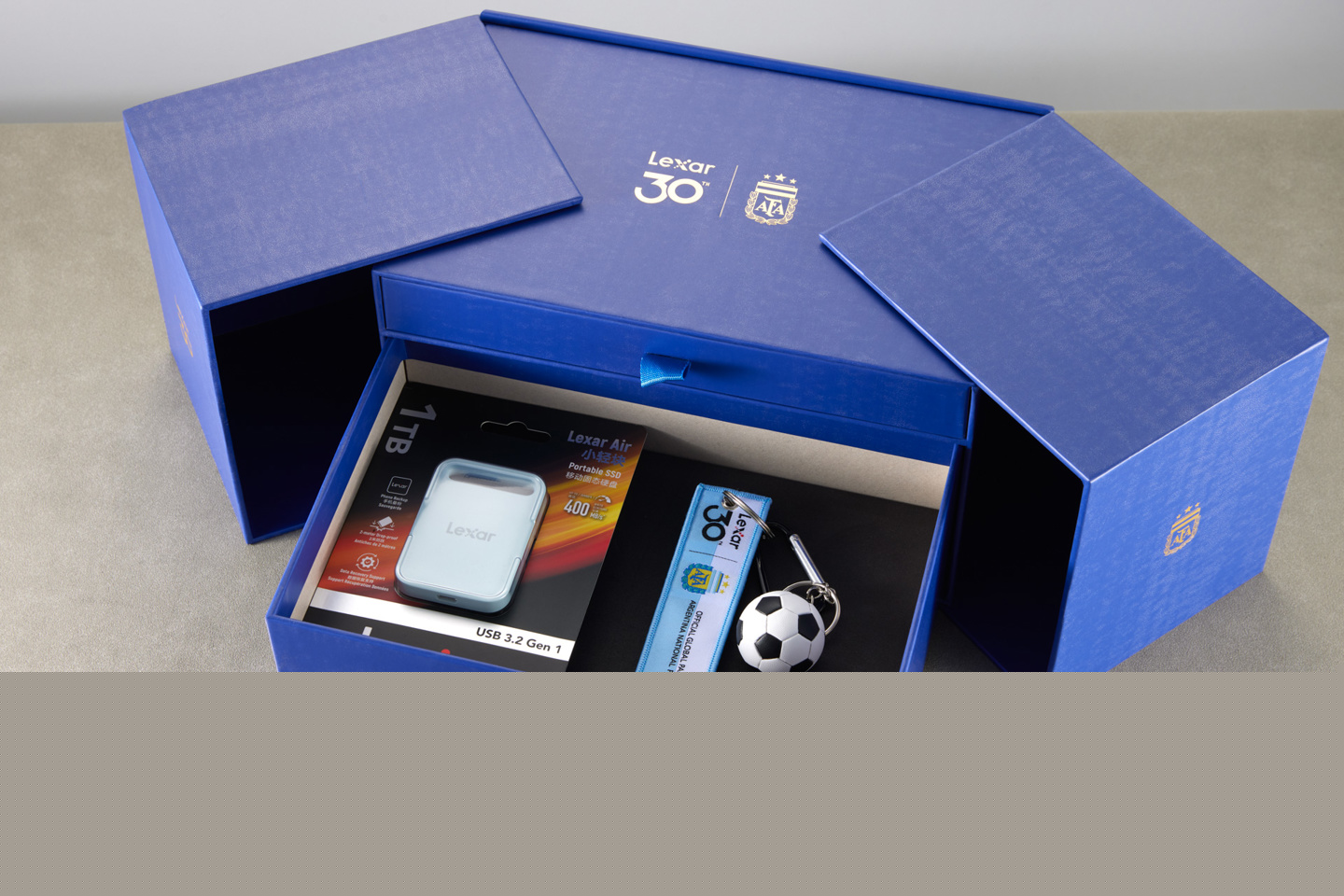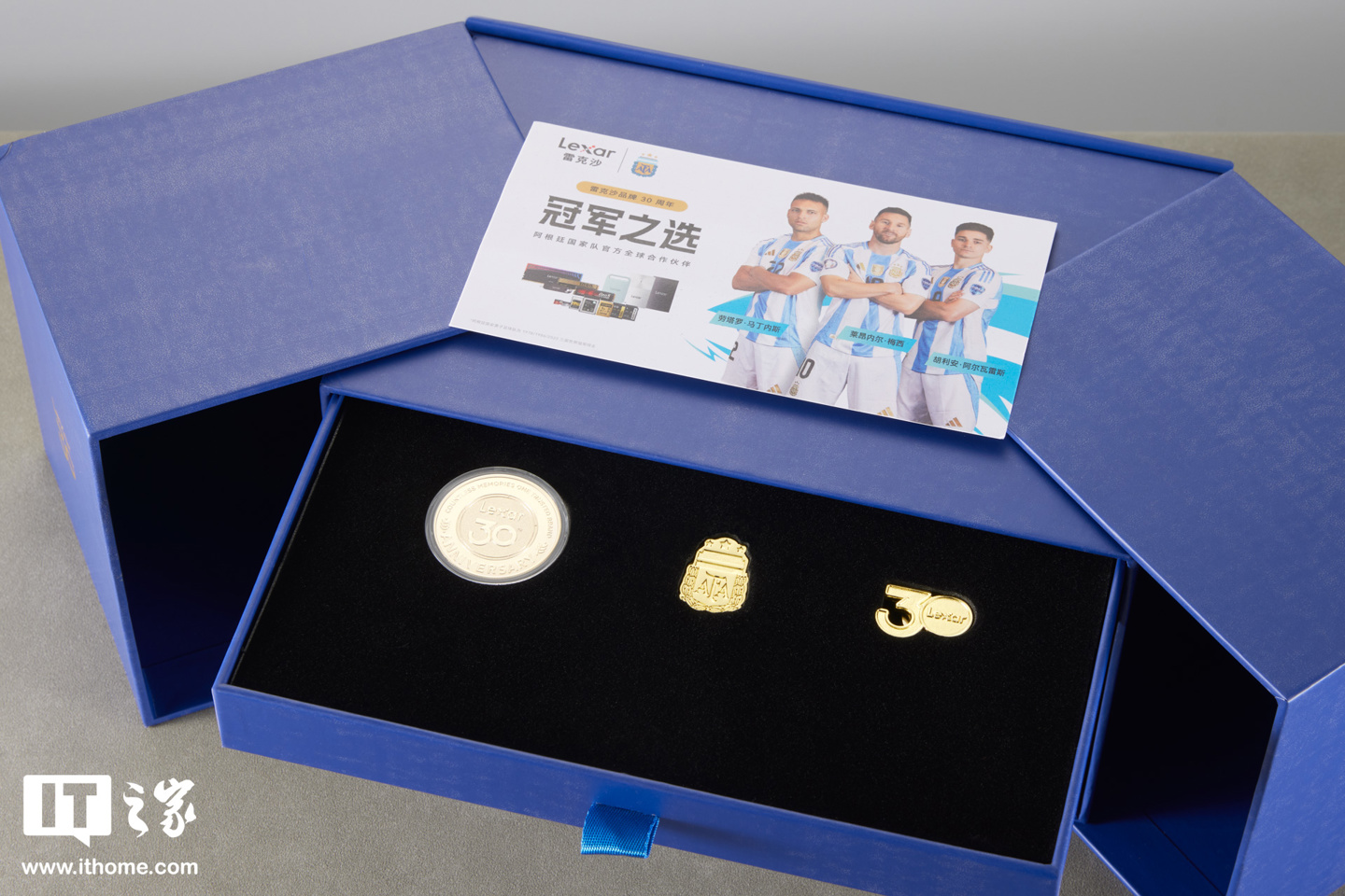 两侧展开有两层“抽屉”,下层是雷克沙 Air 小轻块移动固态硬盘产品和阿根廷国家队主题的钥匙扣,上层是三枚雷克沙 30 周年和阿根廷国家队主题的纪念徽章、纪念币。