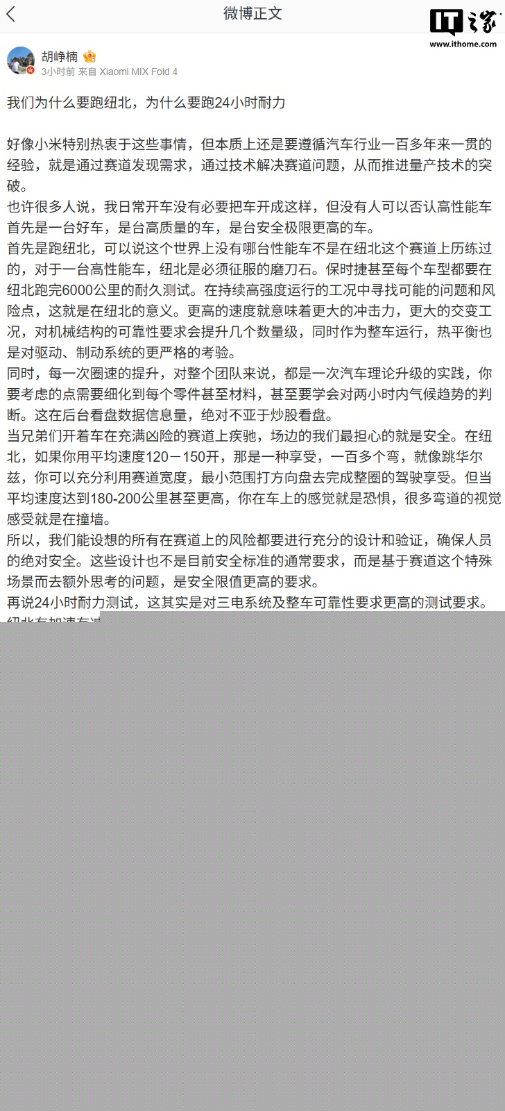 1 月 19 日消息,顺为资本投资合伙人胡峥楠今日在微博发文,回应小米汽车为什么要跑纽北及 24 小时耐力,整理如下。