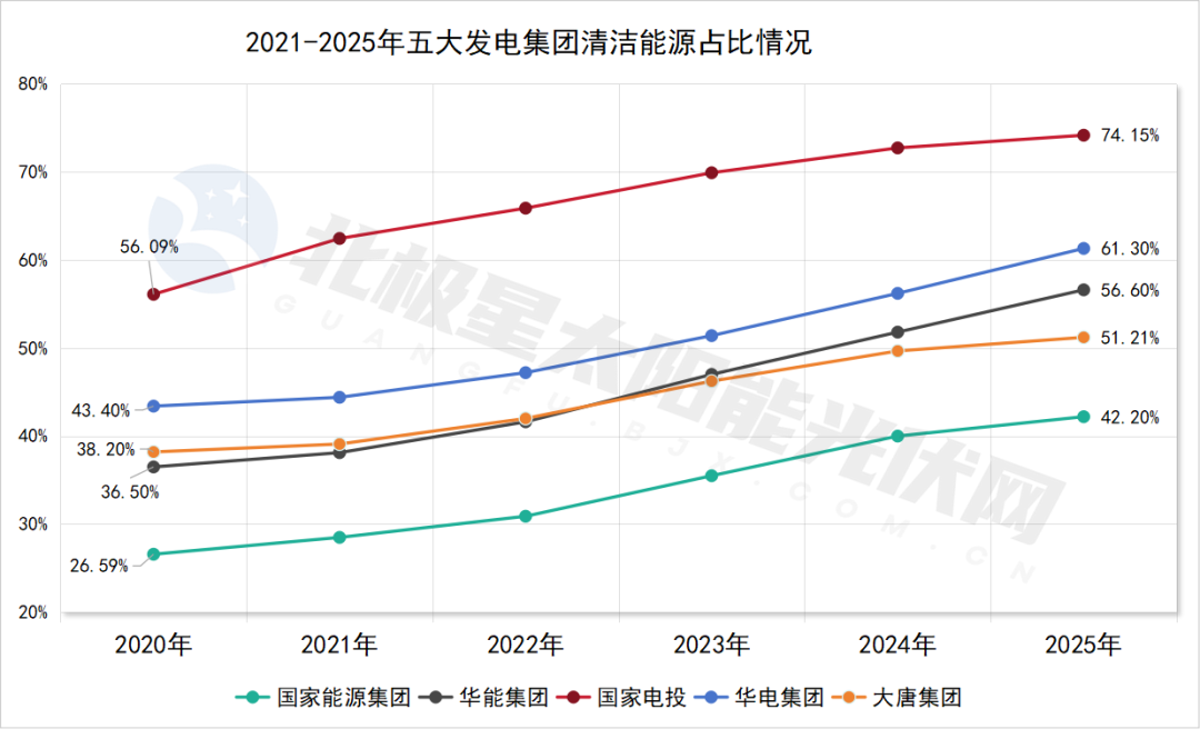 具体而言,国家电投在清洁能源转型方面表现最为突出,其清洁能源占比从2020年的56.09%稳步提升至2025年的74.15%,清洁能源装机容量已超过2亿千瓦。
