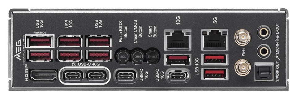 后部接口:2× USB-C 40Gbps、2× USB-C 10Gbps、9× USB-A 10Gbps、1× HDMI 2.1 FRL、1× 10GbE RJ45、1× 5GbE RJ45、一对 Wi-Fi 天线插孔、2× 音频插孔、1× S/PDIF-out。