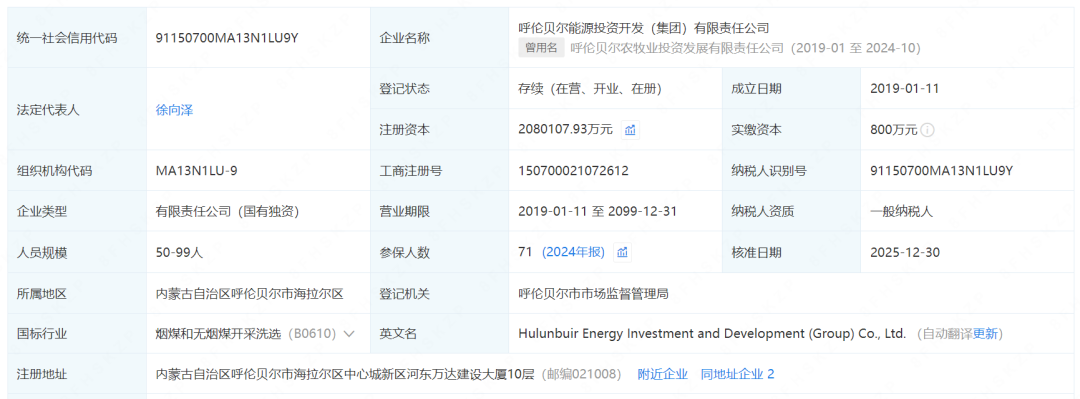 呼伦贝尔能源投资开发(集团)有限责任公司成立于2019年1月,法定代表人为徐向泽,经营范围含自有资金投资的资产管理服务、电力行业高效节能技术研发、电力设施器材制造、石油制品销售、工程技术服务、企业管理咨询、招投标代理服务、风力发电技术服务、太阳能发电技术服务等。股东信息显示,该公司现由呼伦贝尔市人民正府国有资产监督管理委员会全资持股。