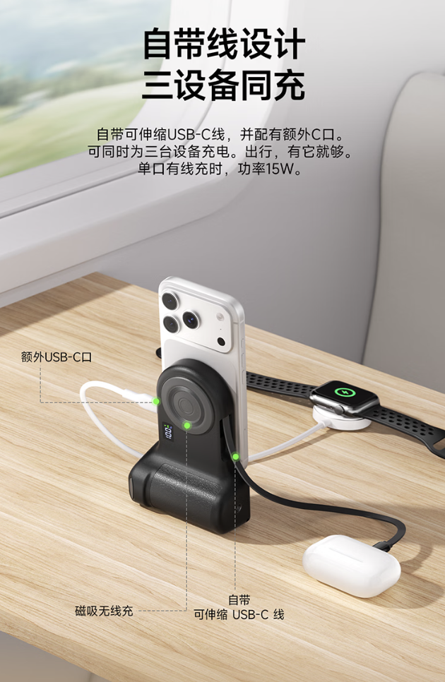 其他方面,该手柄可当充电宝使用,其提供了 LED 数显屏可展示电量状态,手柄支持为 iPhone7.5W 无线充电,同时自带 USB-C 线可提供 15W 输出。