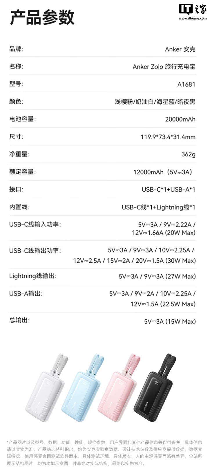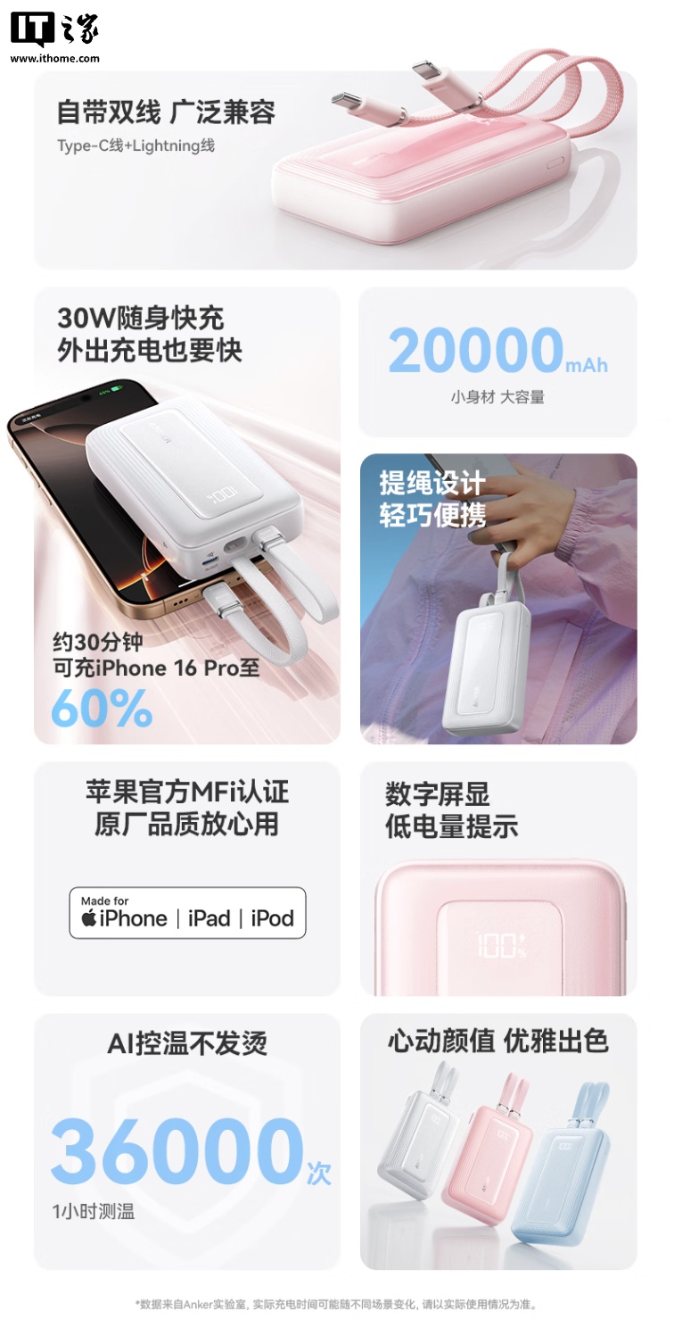 1 月 20 日消息,安克现已在京东上架新款 Zolo 30W 旅行充电宝(A1681),该产品采用 USB-C 及 Lightning 双线设计,内置 20000mAh 电芯,定价为 157 元。