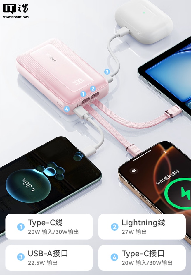 该产品采用 MFi 认证芯片,其中 USB-C 线支持 20W 输入 / 30W 输出、Lightning 线支持 27W 输出、USB-A 接口支持 22.5W 输出、USB-C 接口支持 20W 输入 / 30W 输出。