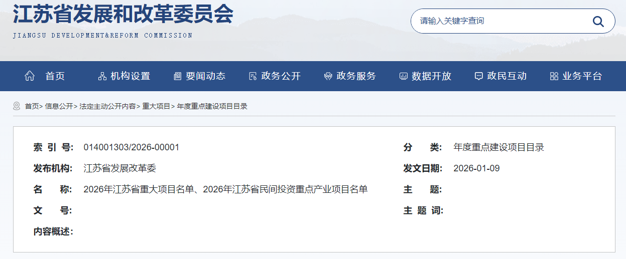 1月9日,江苏省发改委发布2026年江苏省重大项目名单、2026年江苏省民间投资重点产业项目名单。