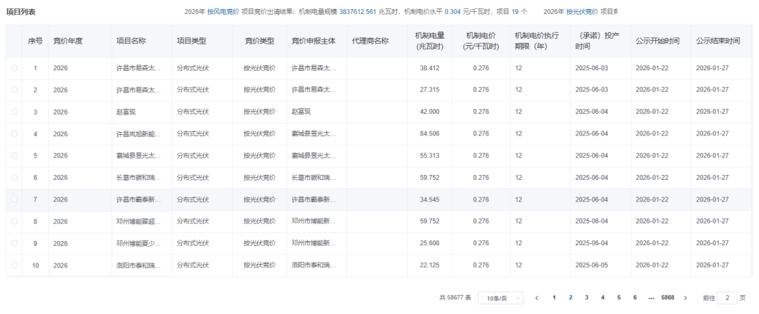 2026年1月22日,国网新能源云公示河南省2026年风、光项目机制电价竞价结果。