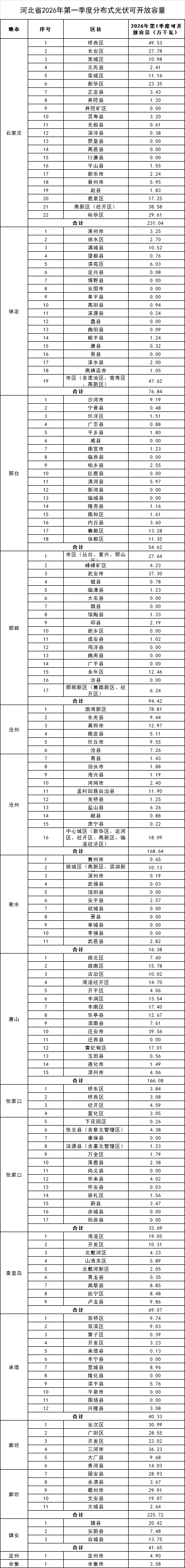 河北省2026年第一季度分布式光伏可开放容量详情见下表: