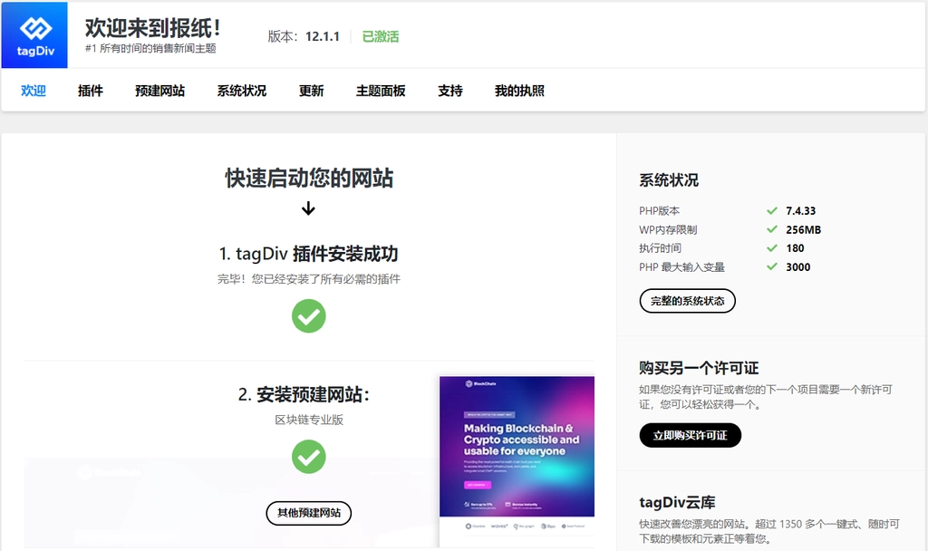 - tagDiv Cloud Library 与 tagDiv Composer 是两个必装插件,如在线安装失败,可在网盘 plugins 目录中下载。