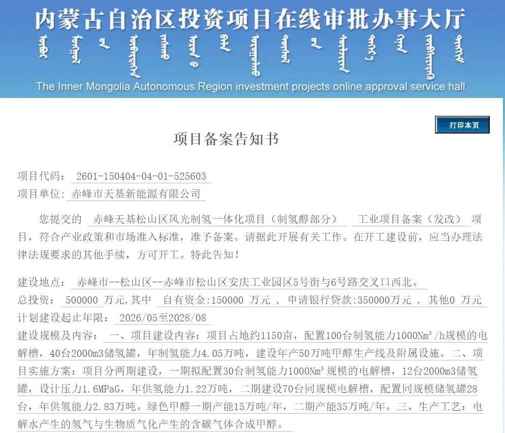 赤峰市天基新能源有限公司提交的赤峰天基松山区风光制氢一体化项目(制氢醇部分)工业项目备案(发改)项目,符合产业政策和市场准入标准,准予备案。