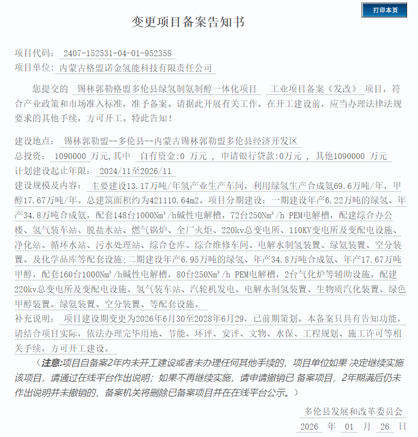 1月26日,内蒙古自治区投资项目在线审批办事大厅发布变更项目备案告知书。信息显示,内蒙古格盟诺金氢能科技有限责任公司提交的锡林郭勒格盟多伦县绿氢制氨制醇一体化项目 工业项目备案(发改)项目,准予备案。