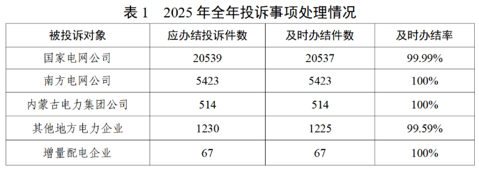 2025年全年,能源企业应办结投诉27773件(含上年结转),及时办结27766件,及时办结率99.97%。