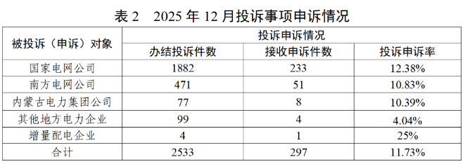 2025年12月,办结投诉事项2533件(含上月结转),热线平台接收申诉事项297件,投诉申诉率11.73%;其中,涉及国家电网公司233件、南方电网公司51件、内蒙古电力集团公司8件、其他地方电力企业4件、增量配电企业1件。