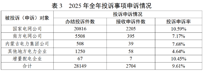 2025年全年,办结投诉事项28149件(含上年结转),热线平台接收申诉事项2704件,投诉申诉率9.61%;其中,涉及国家电网公司2205件、南方电网公司395件、内蒙古电力集团公司39件、其他地方电力企业58件、增量配电企业7件。