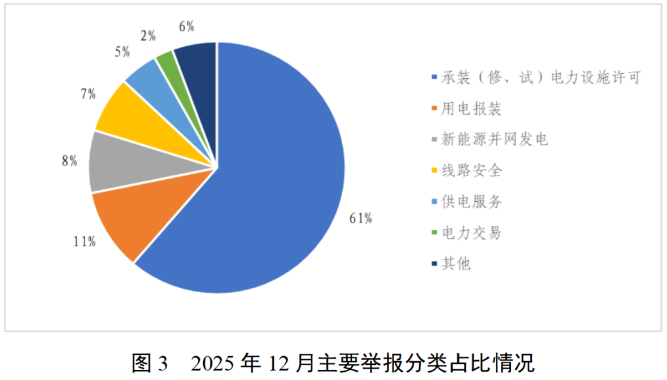2025年12月,热线平台接收举报问题线索124件。其中,承装(修、试)电力设施许可76件、用电保装13件、新能源并网发电10件、线路安全9件、供电服务6件、电力交易3件、其他7件。举报数量较多的省份为:广东11件、陕西11件、安徽10件、河北9件、江西7件。