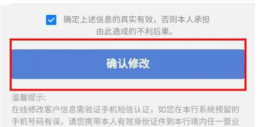 输入认证码,勾选确定上述信息的真实有效,点击确认修改。