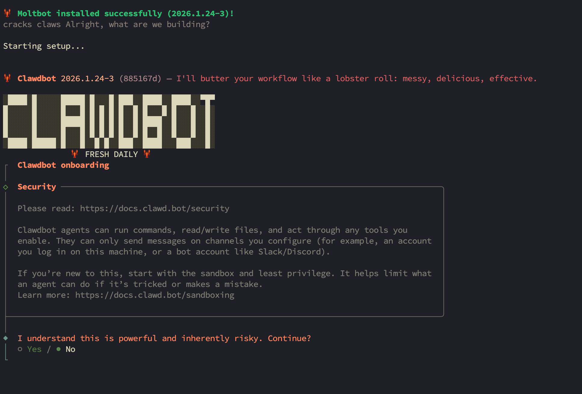 当脚本执行完成后,终端里会自动进入 Clawdbot(现在也叫 Moltbot)的初始化引导界面: