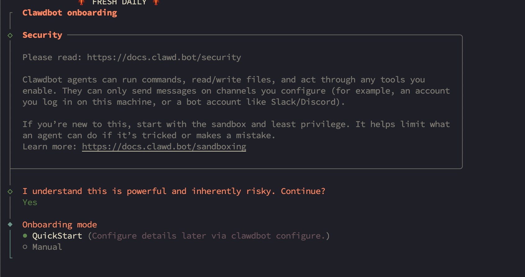 首先出现的就是这个安全确认提示。大概意思是:Clawdbot 属于权限比较高的 AI Agent,后面可能会涉及本地命令、文件读写等操作,官方在这里提前提醒存在一定风险,需要我们确认是否继续。
