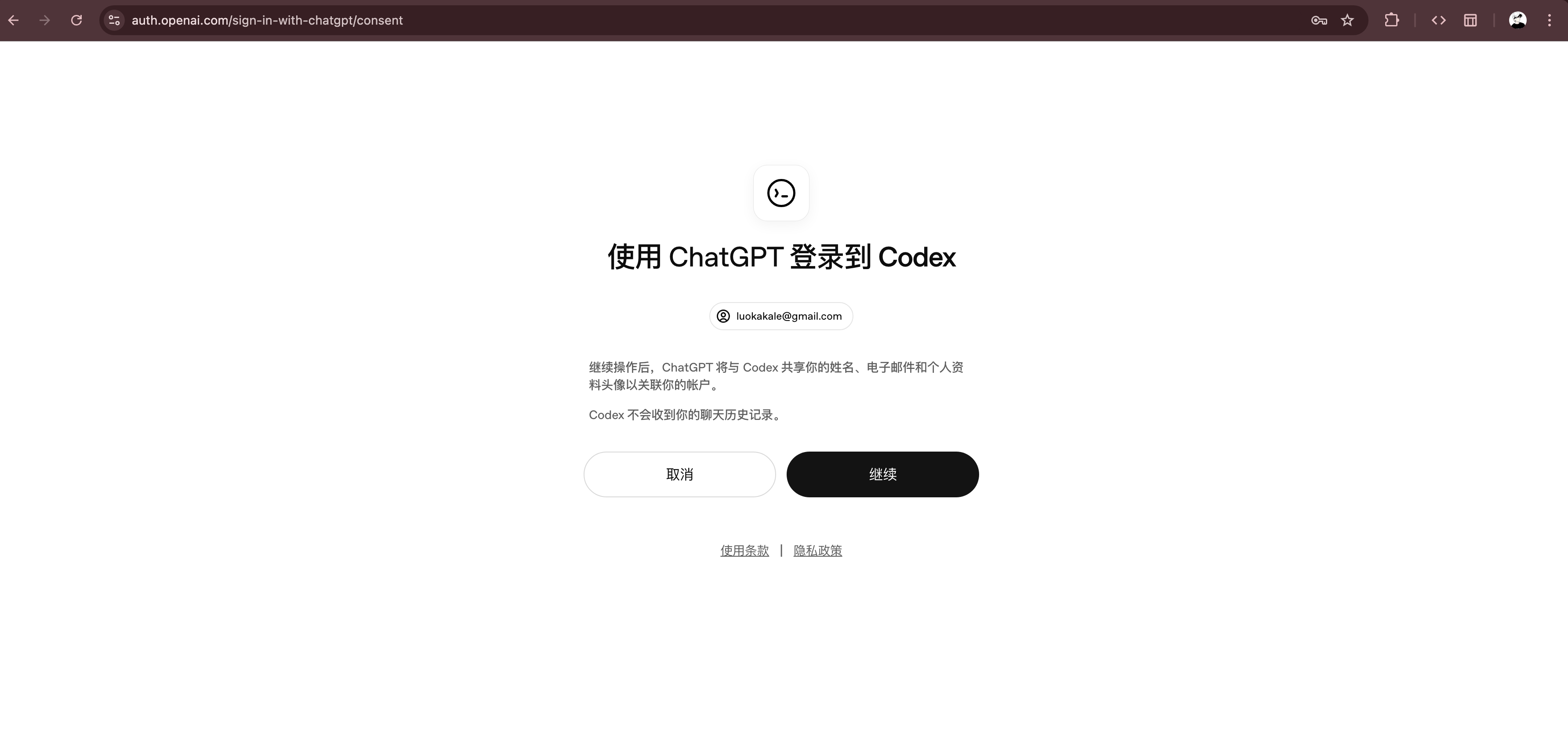 选中后会弹出提示使用ChatGPT 登录到Codex确认页面。