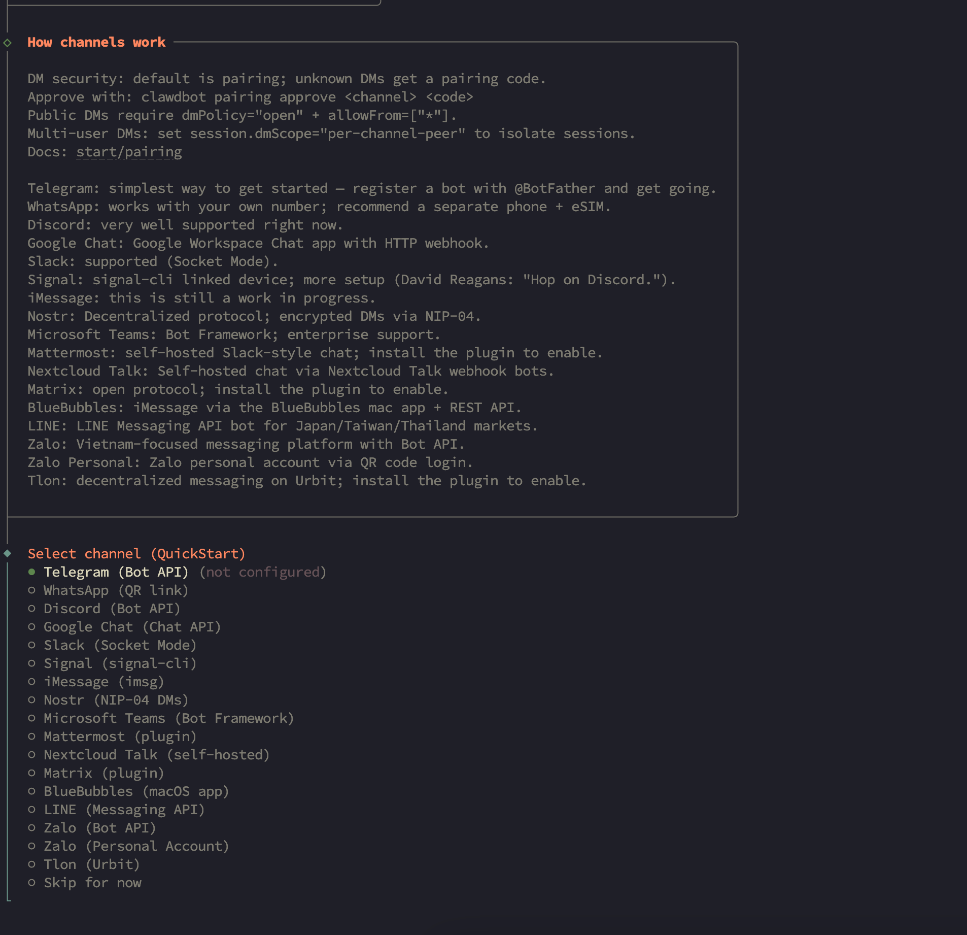 接下来是聊天渠道的选择,Clawdbot 默认支持的渠道非常多,包括 T@elegrimm、WhatsApp、Discord、Slack 等。