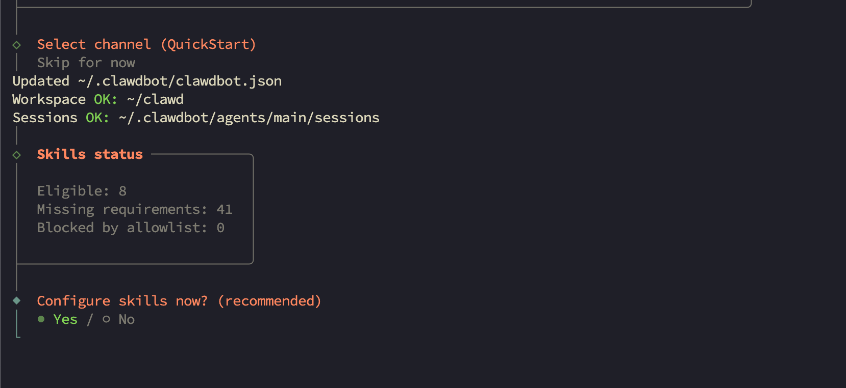 接下来会询问是否要现在配置 Skills(技能)。这里可以理解为一些额外的自动化能力和扩展功能,但并不是安装和基础聊天所必需的内容。