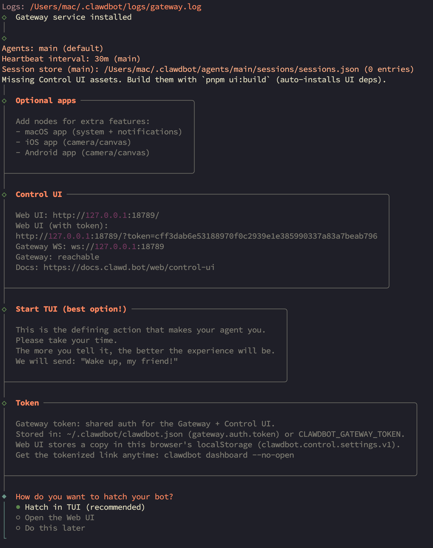 最后会询问以哪种方式启动(hatch)这个 bot,这里提供了终端交互(TUI)、Web 界面以及稍后再说三种方式。