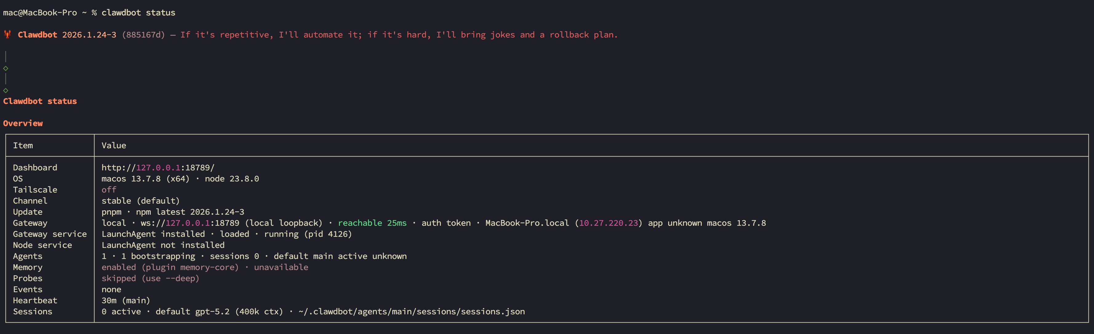安装完成后,可以通过下面这个命令查看 Clawdbot 当前的运行状态: