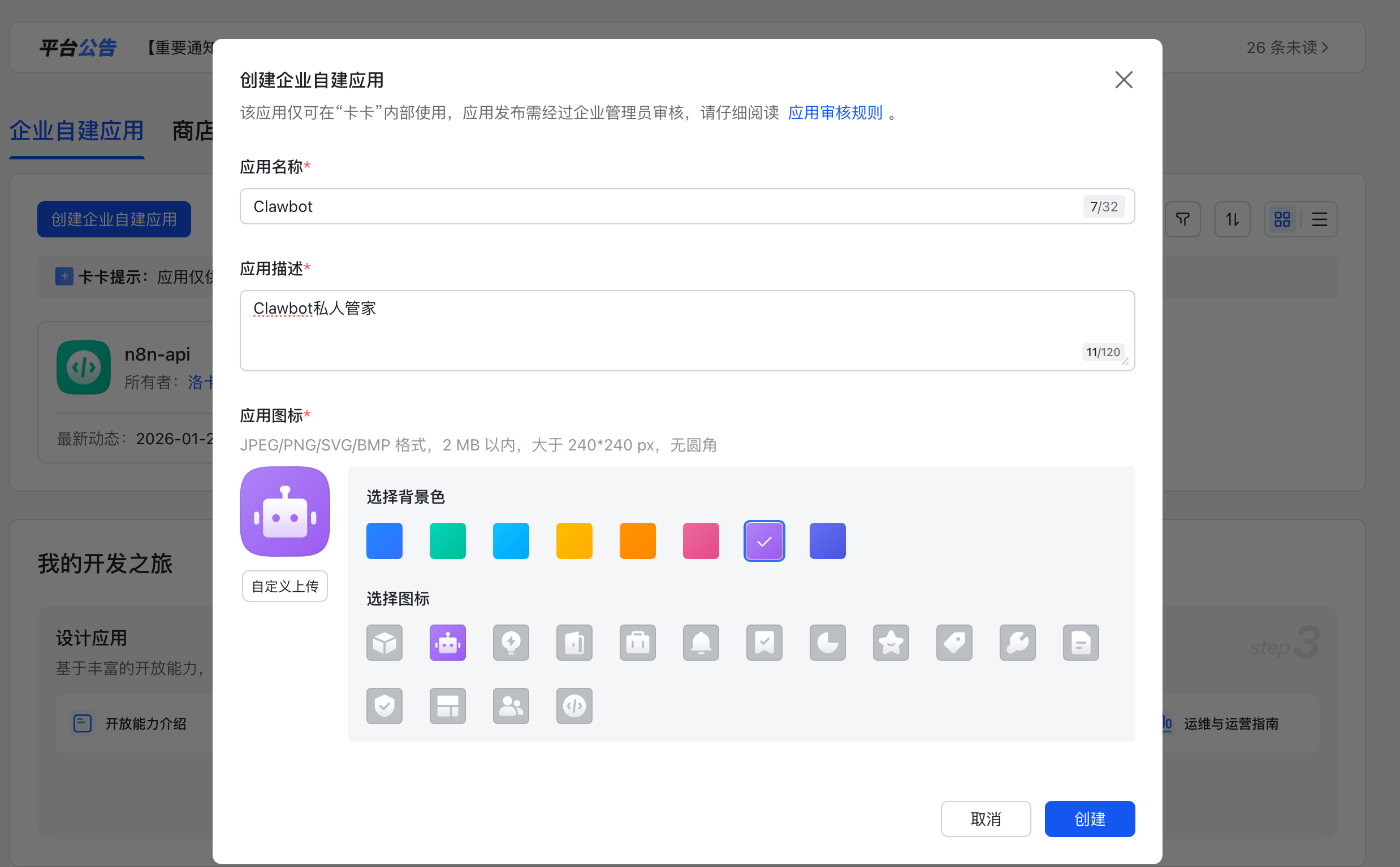 这里创建的是企业内部使用的应用,刚好符合我们把 Clawdbot 接入飞书做个人/团队助手的场景。