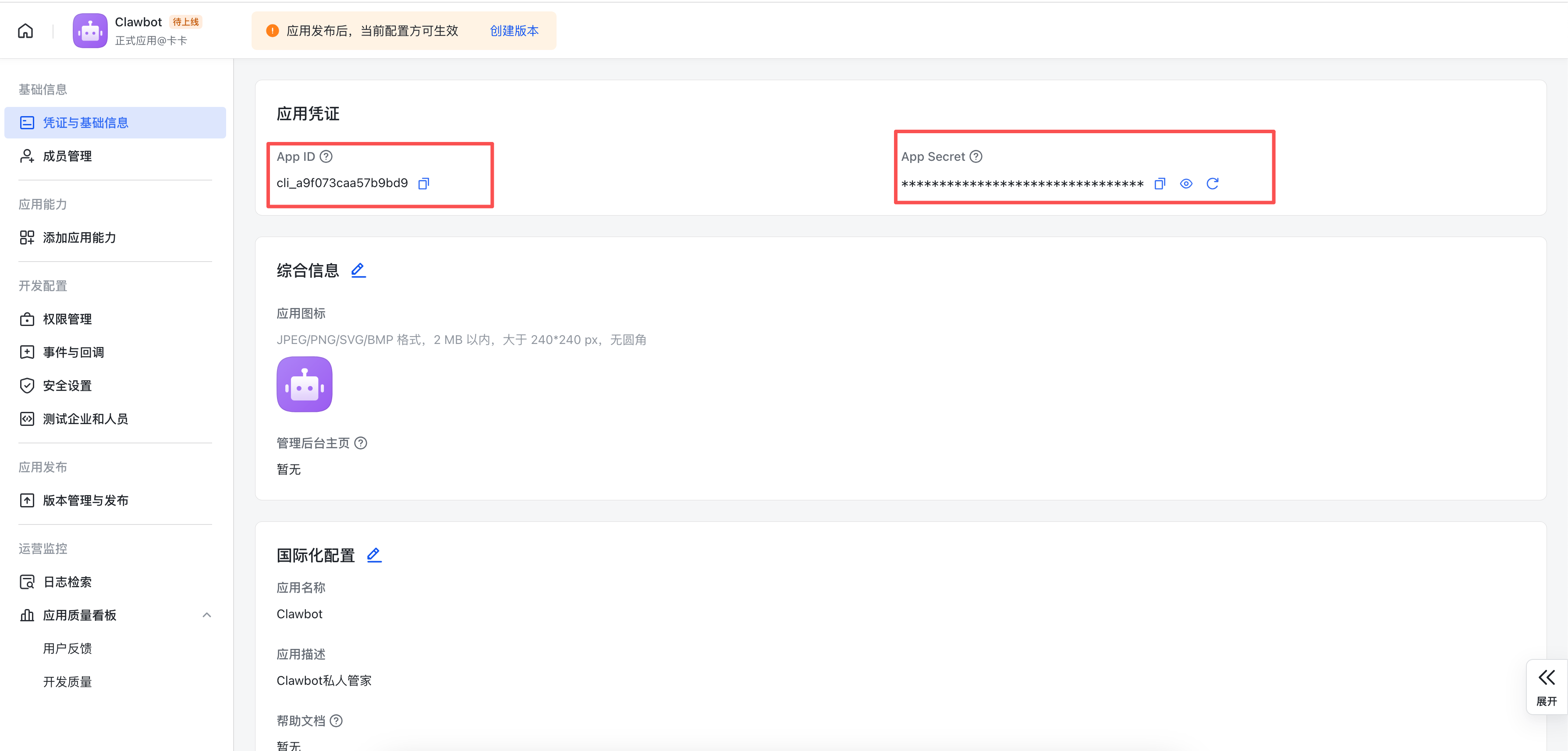 这两个值是后面 Clawdbot 接入飞书时必须用到的身份凭证,记得先复制保存好,不要泄露给其他人。