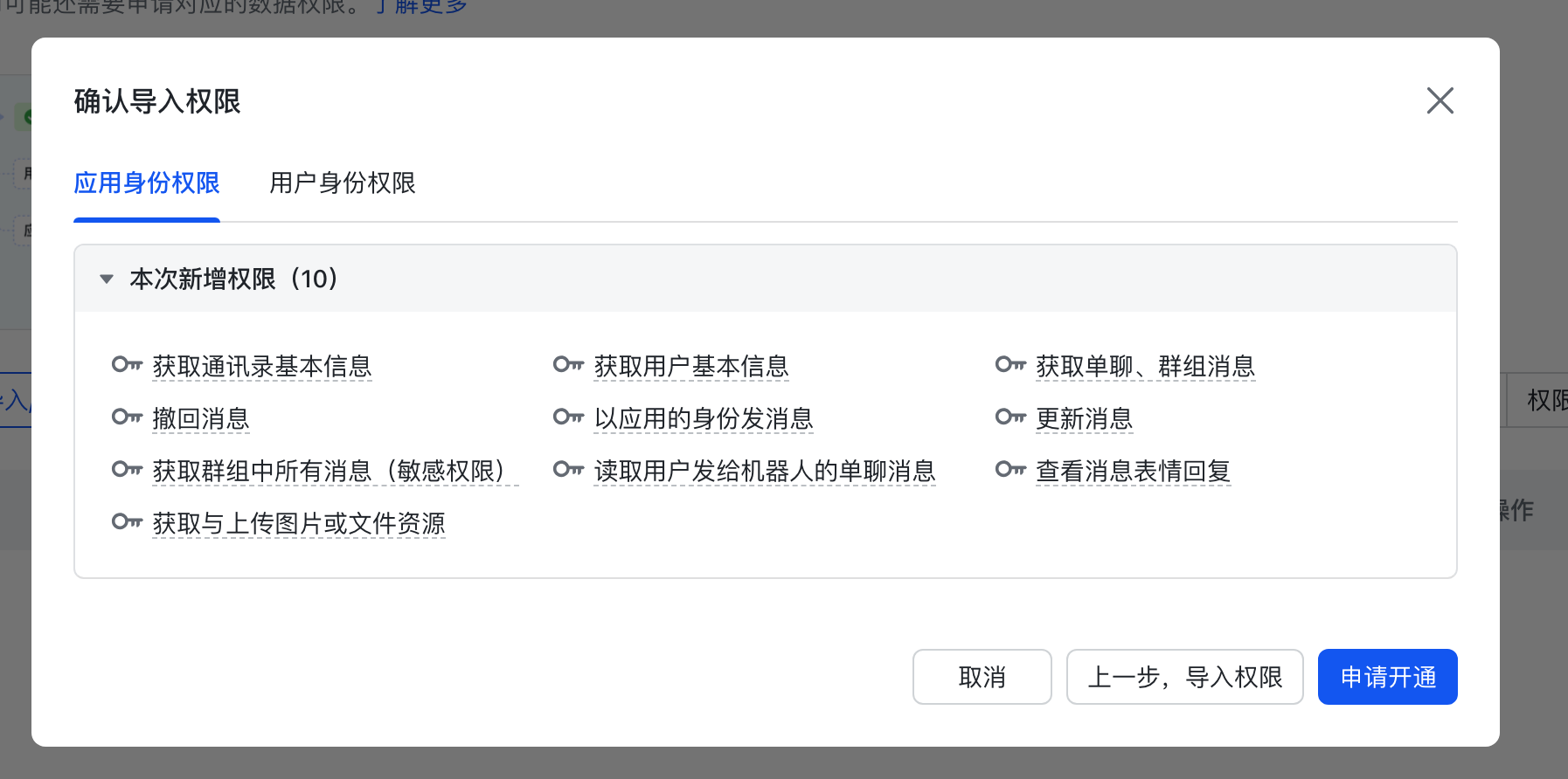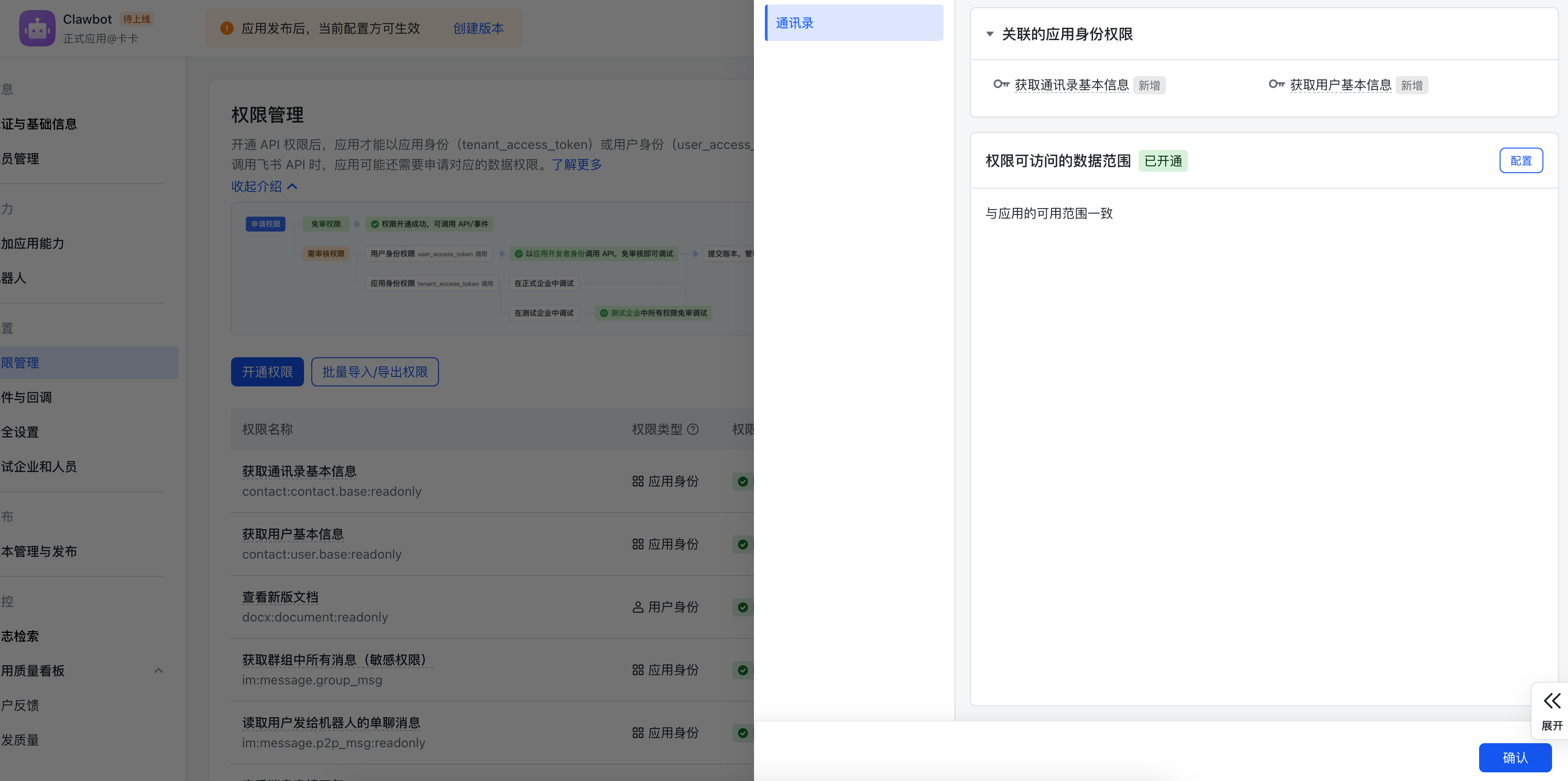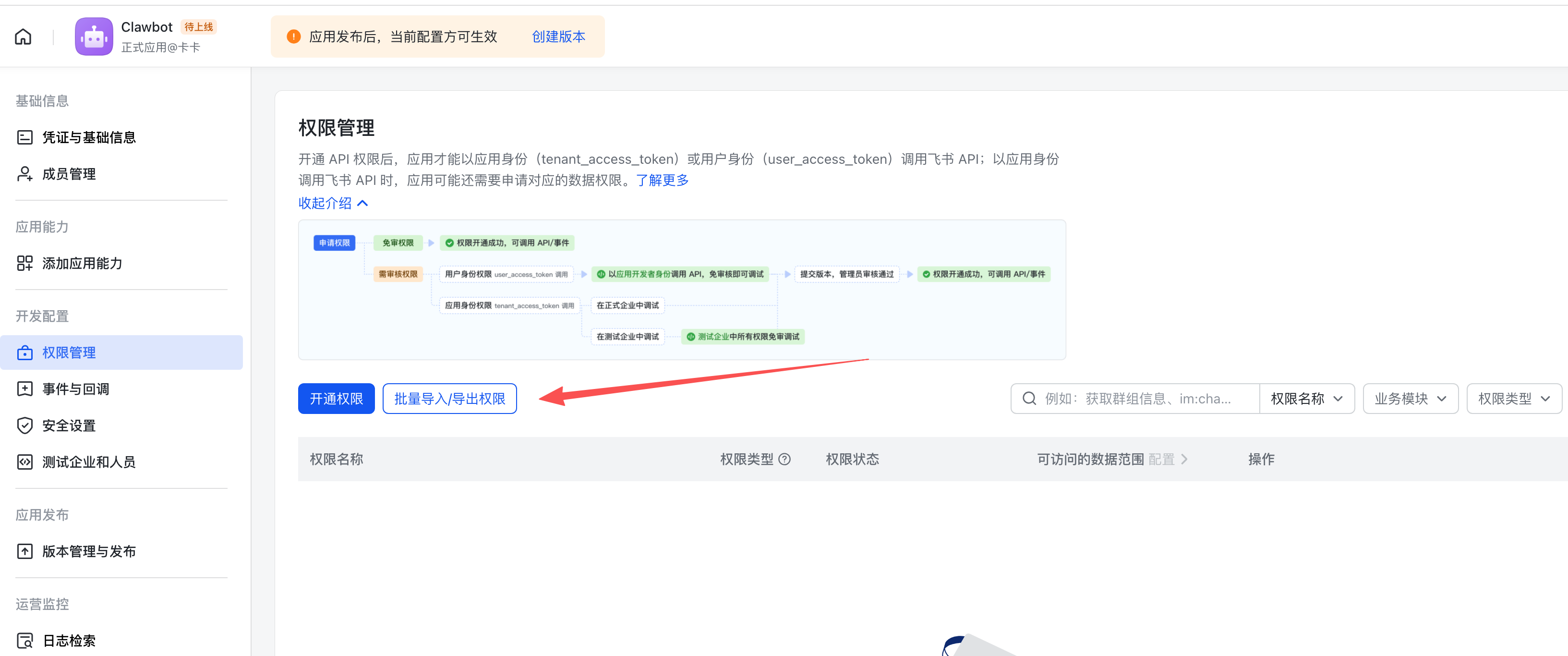 下面我们回到 飞书开放平台 → 当前应用 → 权限管理。