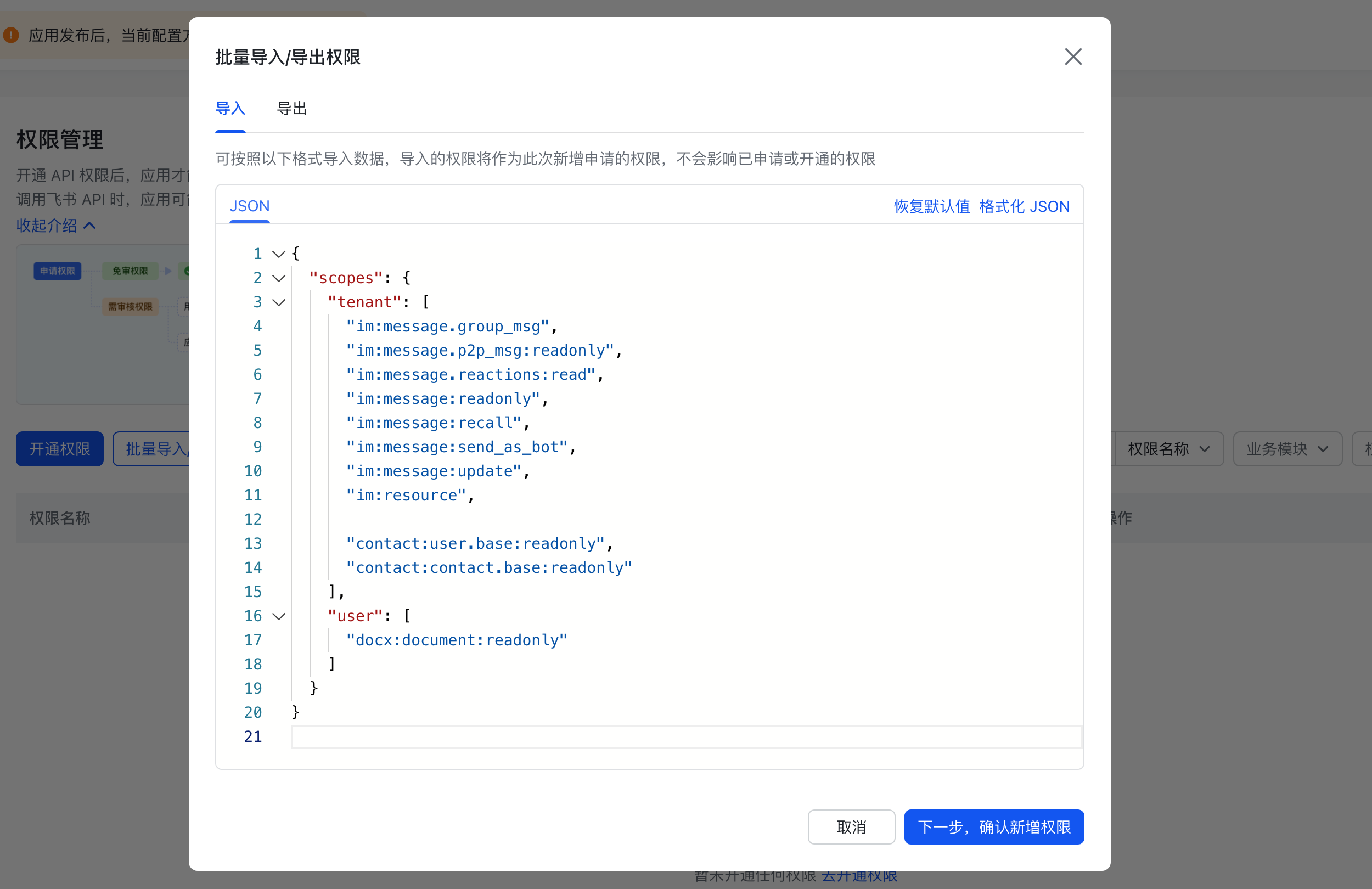 前面把权限 JSON 粘贴进去之后,点击 「下一步,确认新增权限」 就可以了。
