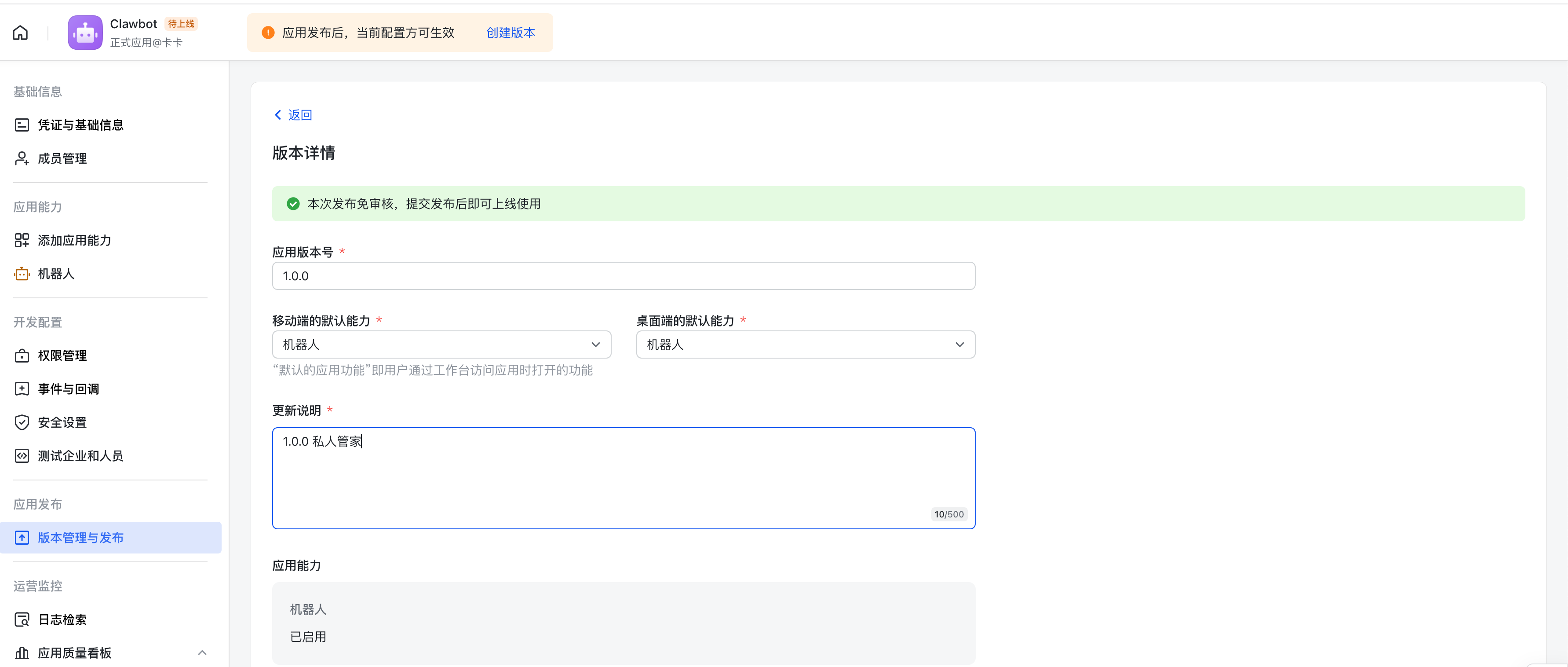 如果页面提示“本次发布免审核,提交发布后即可上线使用”,说明这是企业自建应用,发布完成后权限和事件会立刻生效。