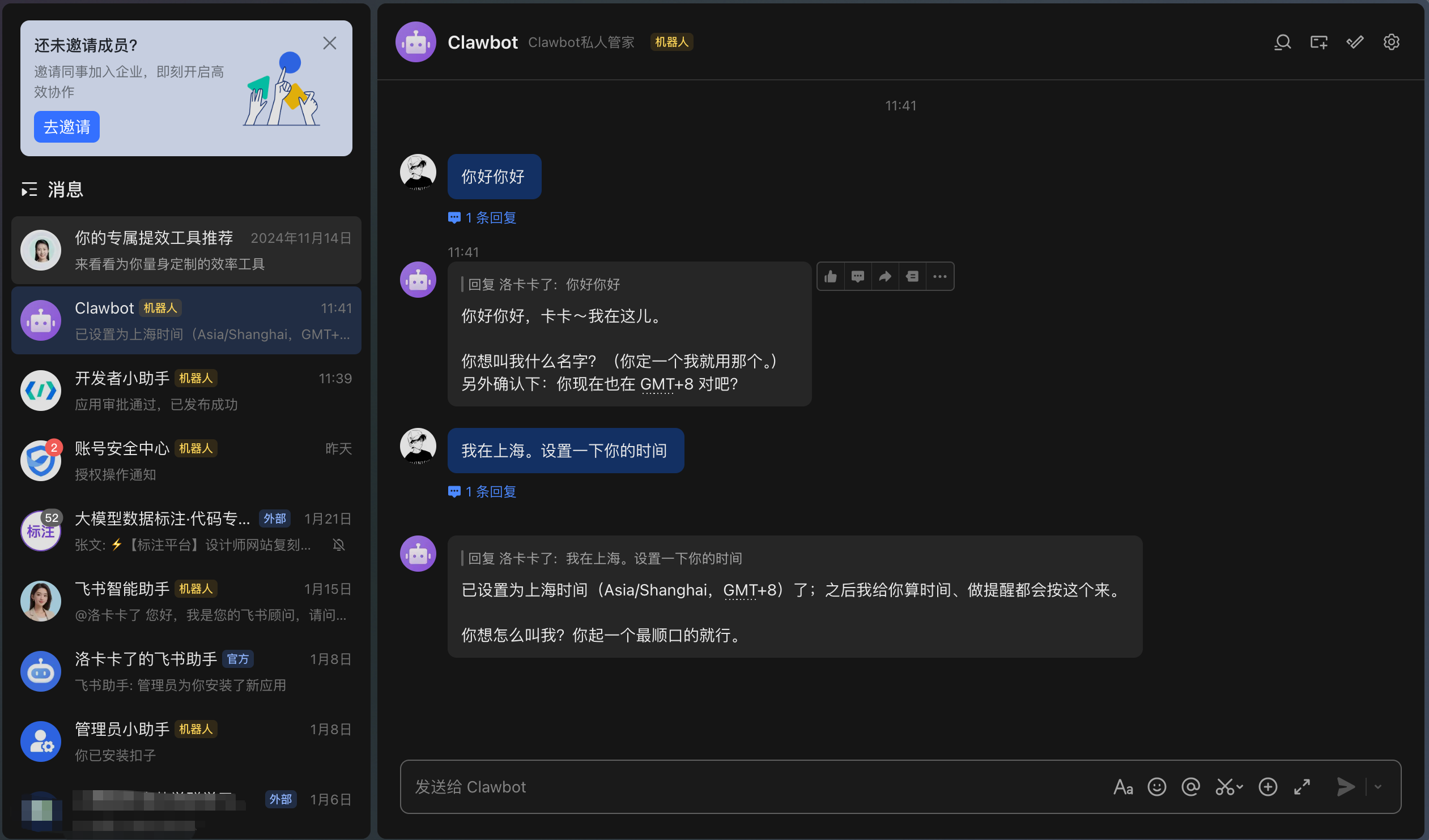 只要能正常对话,说明整个飞书接入流程已经跑通,后面就可以开始接具体的自动化流程或业务逻辑了。