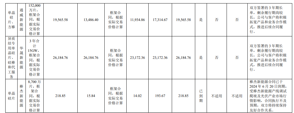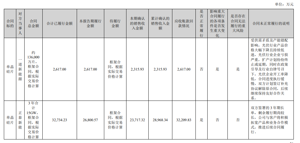 然而,随着行业价格战加剧、供需关系失衡,大额订单的履约情况远不及预期。2025年4月26日,华民股份发布的重大合同进展公告,其与一道新能源2023年签署的13.6亿片单晶硅片合同终止,合同终止前履约金额为2617万元,较此前预估44亿元相去甚远。2024年度财报显示,其与正泰新能、通威、华晟新能源的履行金额执行进度较低。