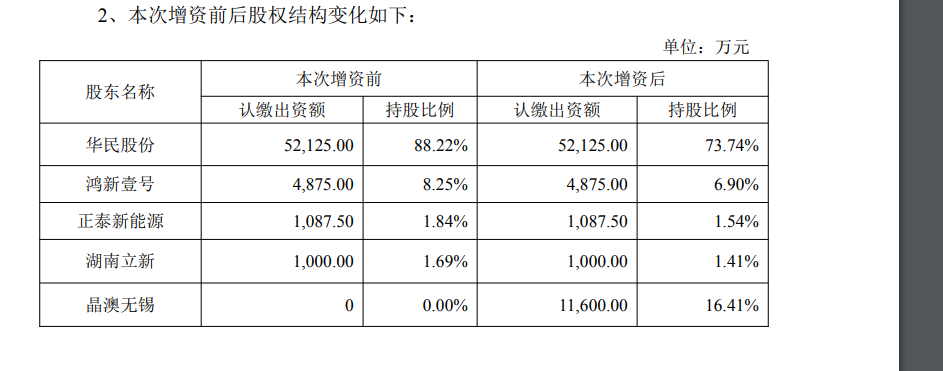 此次晶澳无锡的入局,无疑为鸿新新能源注入了更强动力。根据协议,晶澳无锡以其对鸿新新能源享有的2亿元债权转为股权,其中1.16亿元计入注册资本,0.84亿元计入资本公积。增资完成后,鸿新新能源注册资本增至7.07亿元,华民股份持股比例降至73.74%,仍保持绝对控股地位,晶澳无锡则以16.41%持股成为重要股东。
