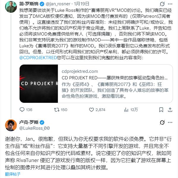 CD Projekt的高管(业务拓展主管)Jan Rosner也在X上回应DMCA警告属实,他表示已经联系过Luke,并告知他必须将该MOD免费提供给所有人(可选择额外捐赠),否则他们将要求将下架该MOD。