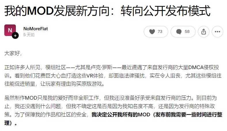 PC VR游戏社区不算大,但4年前与现在相比,舆论环境已经发生了明显变化。同样是Luke Ross收到DMCA版权警告,当年Take-Two Interactive强制他将Mod下架,而CD Projekt的态度较为宽松,只要不强制付费仍可保留Mod。当时还是有不少支持者赞同Luke Ross并认为该公司在“滥用”DMCA版权警告。